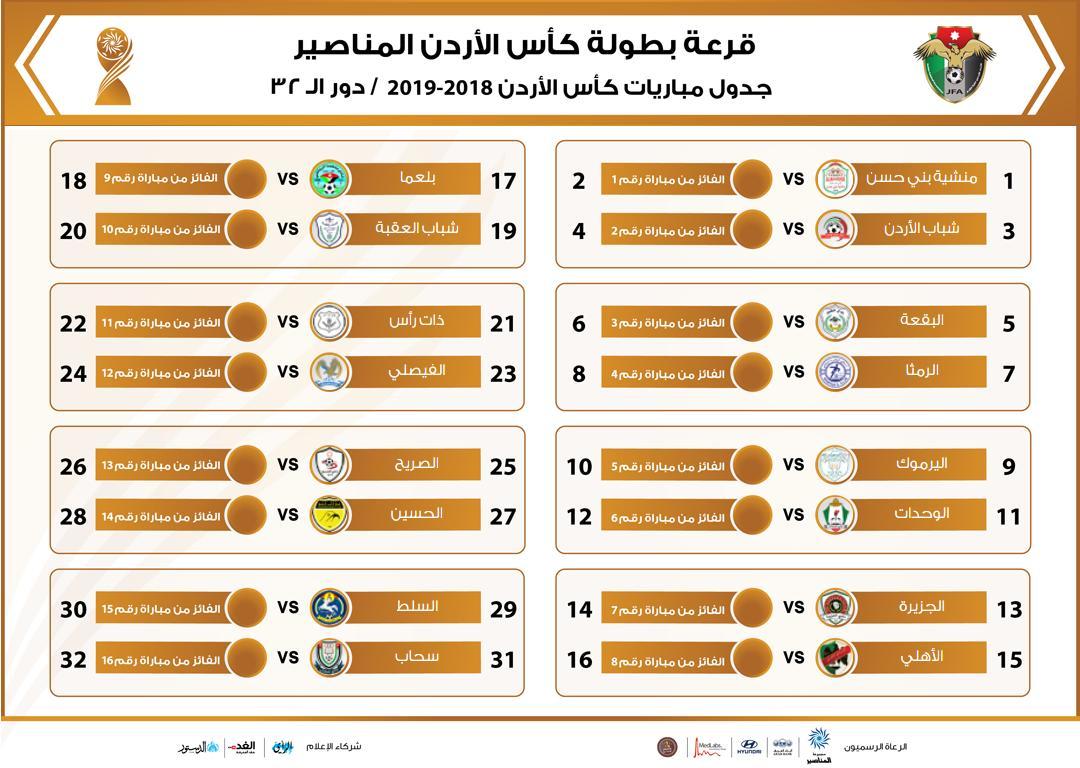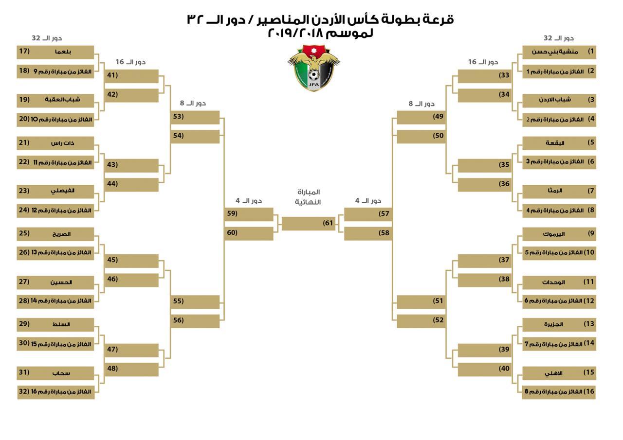 وفي دور الـ32، سيلتقي الوحدات مع الطيبة، والفيصلي مع اتحاد الرمثا، بينما يواجه الجزيرة الفائز من مباراة معان ومغير السرحان.