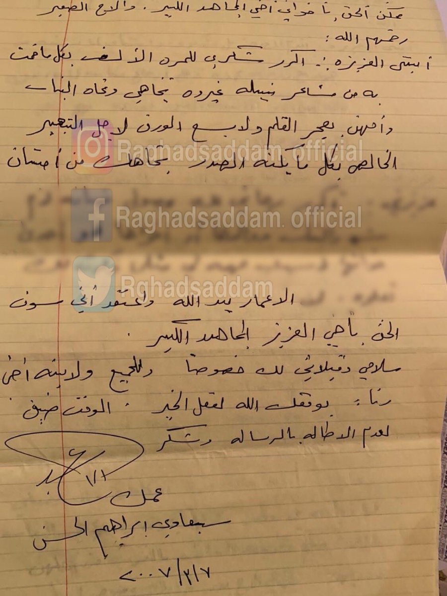 ونشرت رغد، عبر حساب منسوب لها، على "تويتر" صورة لجزء من رسالة والدها وأرفقتها بعبارة: "جزء من رسالة الشهيد الرئيس صدام حسين في أسره لابنته رغد".