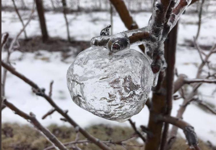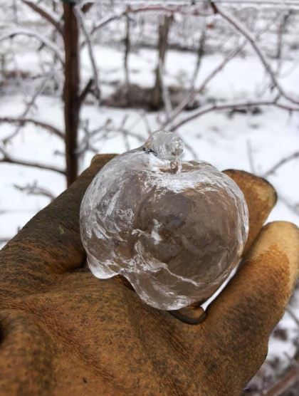 After freezing rain in Michigan, apples that hadn’t been picked got coated in ice. Many fell off the tree. Some had their insides turn to mush as apples have lower freezing points. The mush and skin fell, leaving these “ghost apples.”
