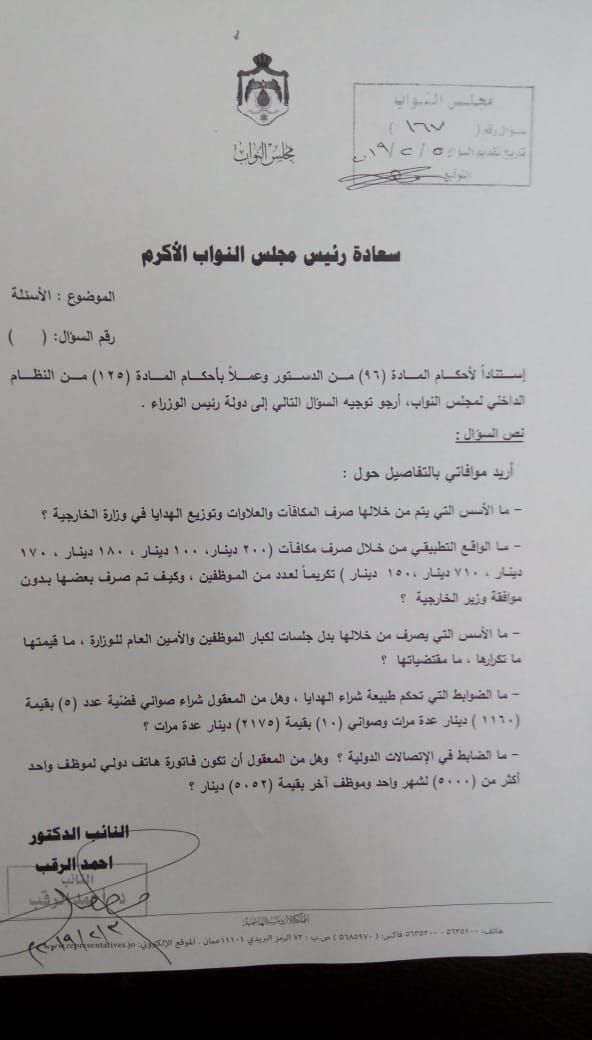 أحداث اليوم - وجه النائب احمد الرقب سؤال نيابي لحكومة الدكتور عمر الرزاز، عبر مجلس النواب، عن الأسس التي يتم من خلالها دفع المكافات والعلاوات وتوزيع الهدايا في وزارة الخارجية.