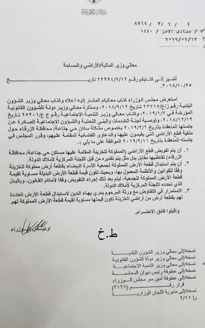 ووافق مجلس الوزراء، الخميس، على تعويض قطع الأراضي (المملوكة للخزينة المقامة عليها مساكن حي جناعة/محافظة الزرقاء) لقاطنيها مقابل بدل مثل يتم تقديره من قبل اللجنة المركزية لأملاك الدولة.