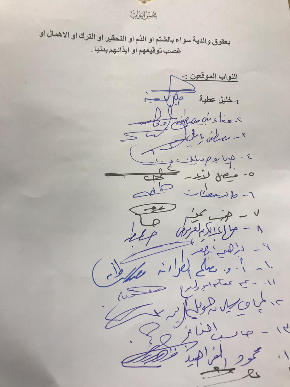 وبينو النواب عبر المذكرة، بملاحقة كل من اساء لوالديه سواء بالشتم او بالذم او التحقير او الترك او الاهمال او غصب توقعيهم او ايذائهم بدنيا.