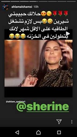 الفنانة الإماراتية أحلام بدورها ردت على شيرين عبد الوهاب، ونشرت صورة عبر خاصية "القصص المصوّرة" عبر تطبيق "انستقرام"، معلقة على حديث شيرين في تمنيها في رغبتها بارتداء طاقية الإخفاء ودخول خزانة أحلام لرؤية مجوهراتها، وقالت: "حلالك حبيبتي شيرين بس لازم تشتغل الطاقية على الأقل شهر لأنك بتطولين في الخزنة".
