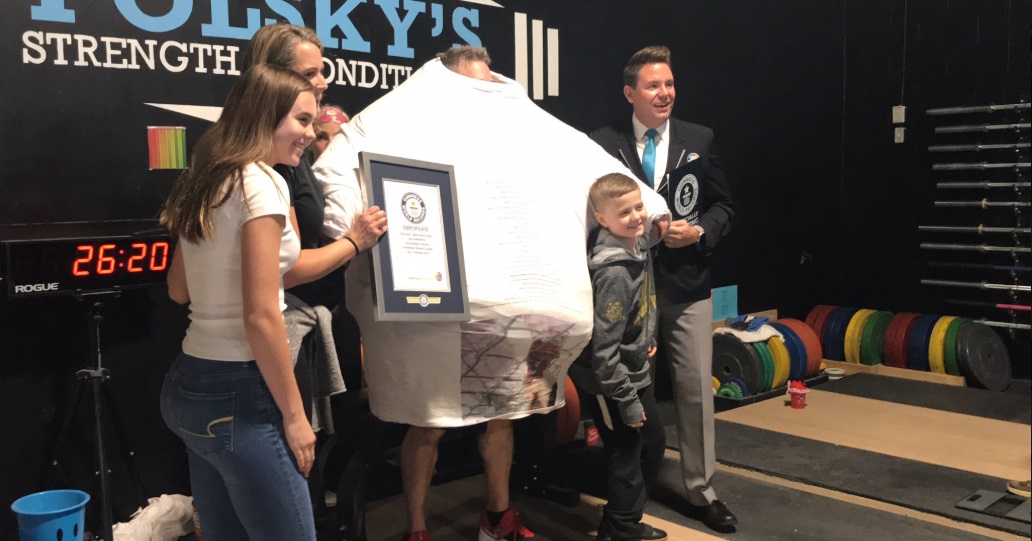 وأضاف: ”ثم طلبنا عددًا من التيشيرتات مختلفة المقاسات وصولًا إلى 20 XL من الهند، ووضع خطط لمحاولة تحطيم الرقم القياسي في صالة بولسكي سترينغس للألعاب الرياضية في مدينة كيتشنر“.