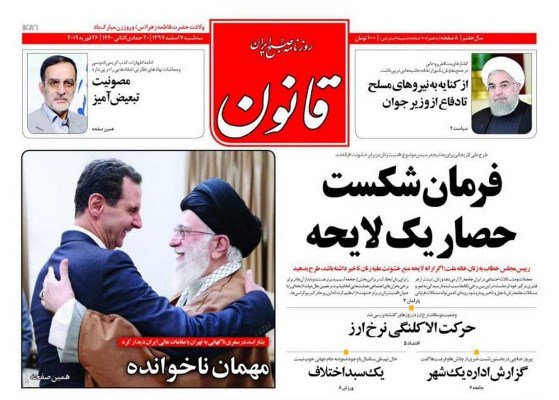 أحداث اليوم - أغلقت السلطات الإيرانية صحيفة "قانون" ذات التوجه الإصلاحي بسبب العنوان الذي نشرته تعليقا على لقاء المرشد الأعلى علي خامنئي بالرئيس السوري بشار الأسد أمس الاثنين في طهران.