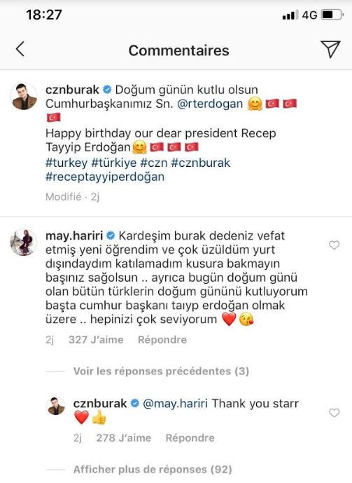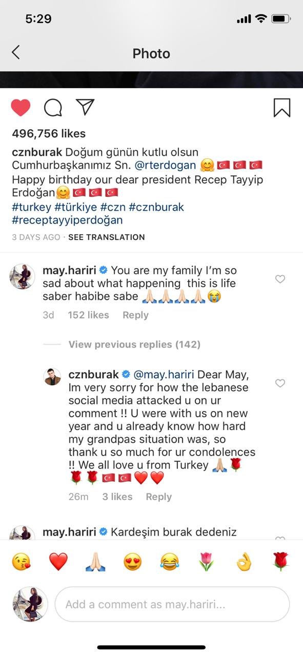 وكانت حريري أوضحت، أنّ علاقة صداقة تجمعها بعائلة الشيف التركي، وأنّ جده قد توفي مؤخراً فقدمت العزاء لعائلته أولاً، ثم له بتعليق عبر حسابه، كاشفة أنّ اتصالاً قد جرى بينها وبين بوراك بعد الضجّة التي أحدثها التعليق، حيث طلب منها الأخير عدم الاهتمام لكون المتابعين ليسوا على علم بوفاة جدّه.