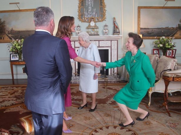 وانتشرت صورة رسمية تجمع الملكة مع ضيوفها الملكيين، حيث ارتدت ثوبا أبيض أنيقا.