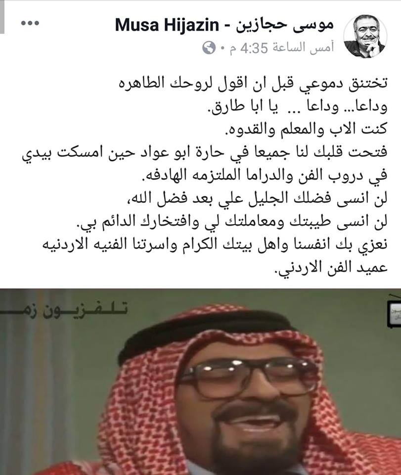 رصد - نعى الفنان الأردني موسى حجازين زميله الفنان نبيل المشيني، واصفًا إيًّاه بمن فتح قلبه للجميع في "حارة أبو عواد"، الأحد.
