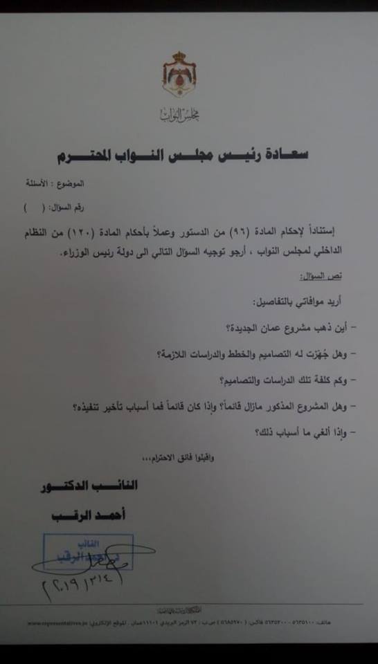 أحداث اليوم - وجه النائب أحمد الرقب سؤالاً نيابياً إلى رئيس الوزراء عمر الرزاز حول مشروع عمان الجديدة، والذي أعلنته الحكومة السابقة.