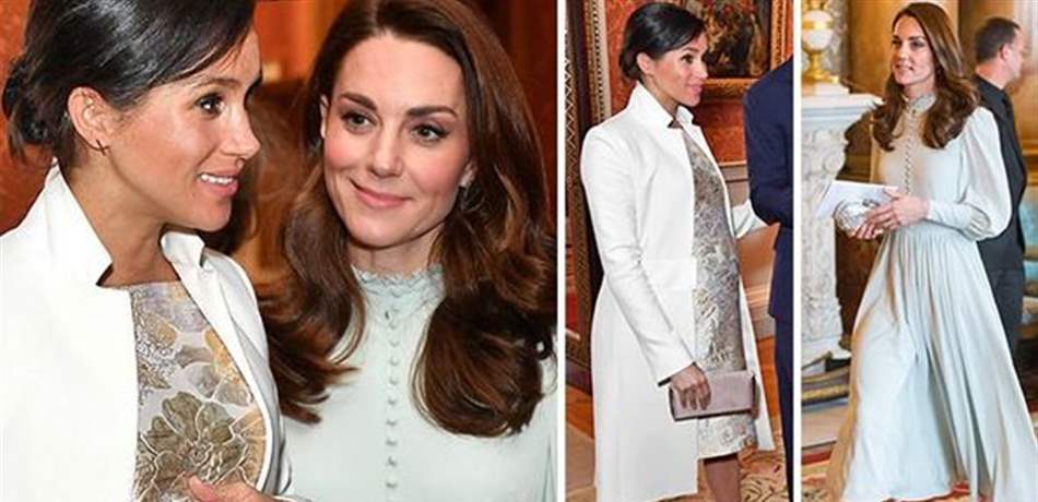وأطلت كيت، الأم لثلاثة أطفال من زوجها الأمير وليام، في الحفل، بفستان من فوق الركبة، وبه أزرار وأكمام طويلة، بينما ارتدت ميغان، الحامل في طفلها الأول من زوجها الأمير هاري، بفستان من البروكار المتلألئ يتميز بطباعة زهرية، وارتدت فوقه معطفا أبيض اللون.