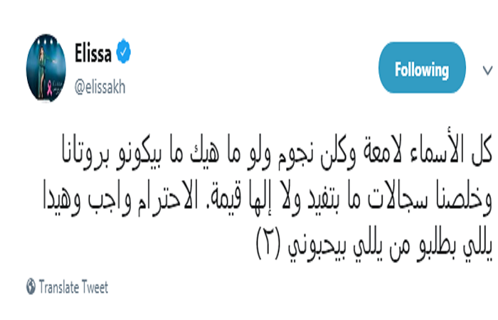 وتابعت: "كل الأسماء لامعة وكلن نجوم ولو ما هيك ما بيكونو بروتانا وخلصنا سجالات ما بتفيد ولا إلها قيمة.. الاحترام واجب وهيدا يللي بطلبو من يللي بيحبوني".