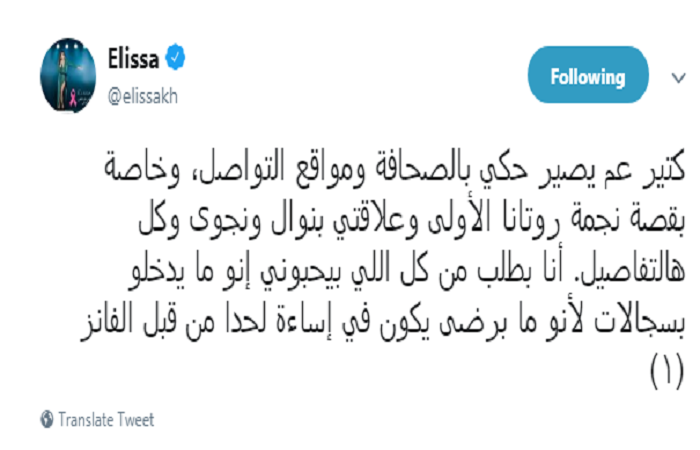 وكتبت اليسا تغريدة عبر "تويتر" قائلة: "كتير عم يصير حكي بالصحافة ومواقع التواصل وخاصة بقصة نجمة روتانا الأولى وعلاقتي بنوال ونجوى وكل هالتفاصيل".