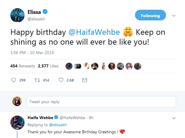 على صعيد متصّل، عايدت الفنانة إليسا، هيفا بمناسبة عيد ميلادها حيث وجّهت لها رسالة عبر صفحتها الخاصّة على "تويتر". وكتبت إليسا: "عيد ميلاد سعيد هيفا، إبقي مشرقة حيث لن يكون أحد مثلك". لتردّ عليها هيفا قائلة: " شكرا لك على معايدتك الرائعة".