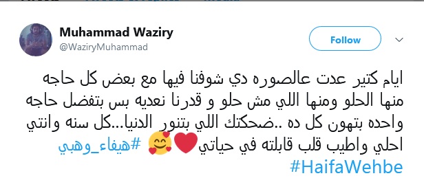 ونشر وزيري صورة قديمة جمعته بهيفا أرفقها بتعليق: "ايام كتير عدت عالصورة دي شوفنا فيها مع بعض كل حاجة منها الحلو ومنها اللي مش حلو وقدرنا نعديه بس بتفضل حاجة واحدة بتهون كل ده.. ضحكتك اللي بتنور الدنيا... كل سنة وانتي احلى واطيب قلب قابلته في حياتي".