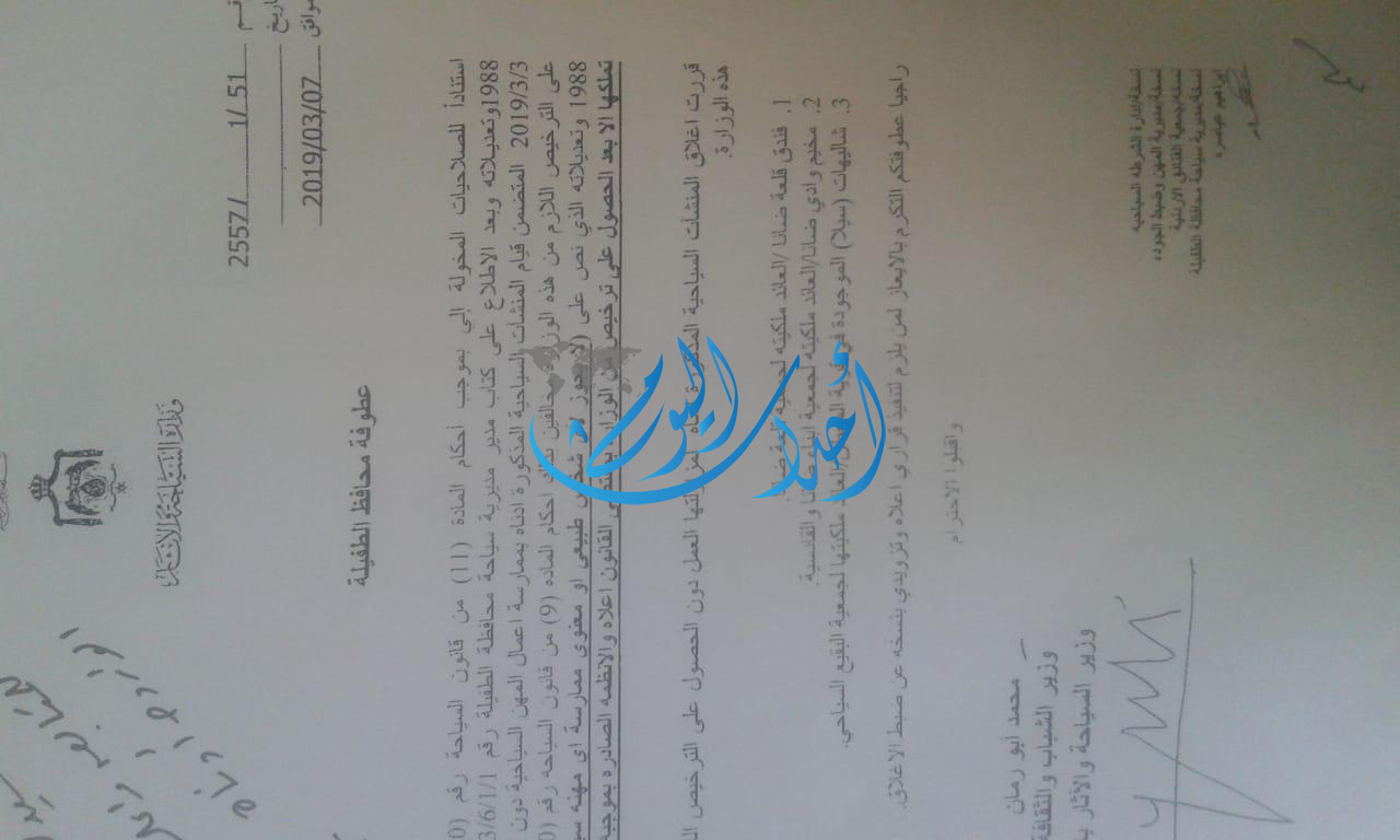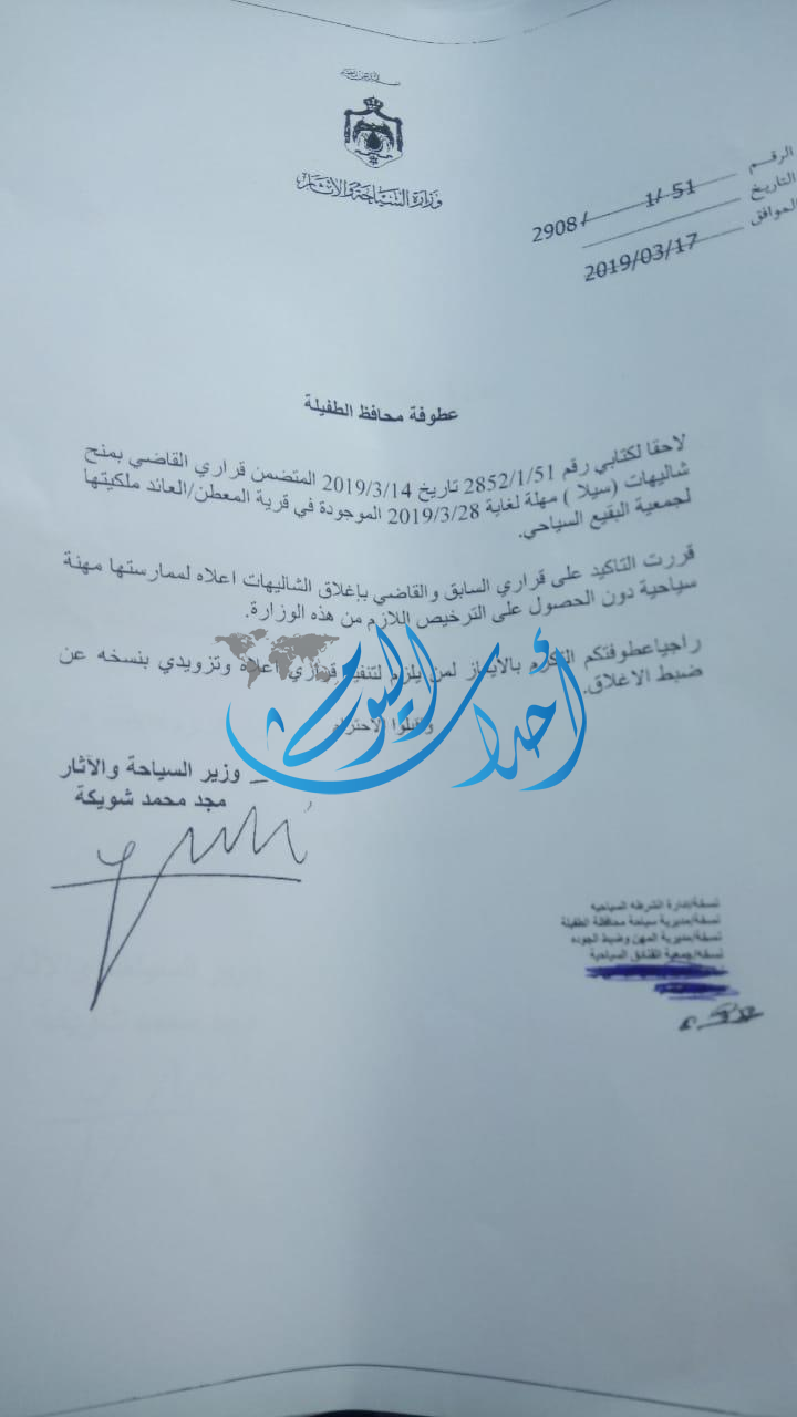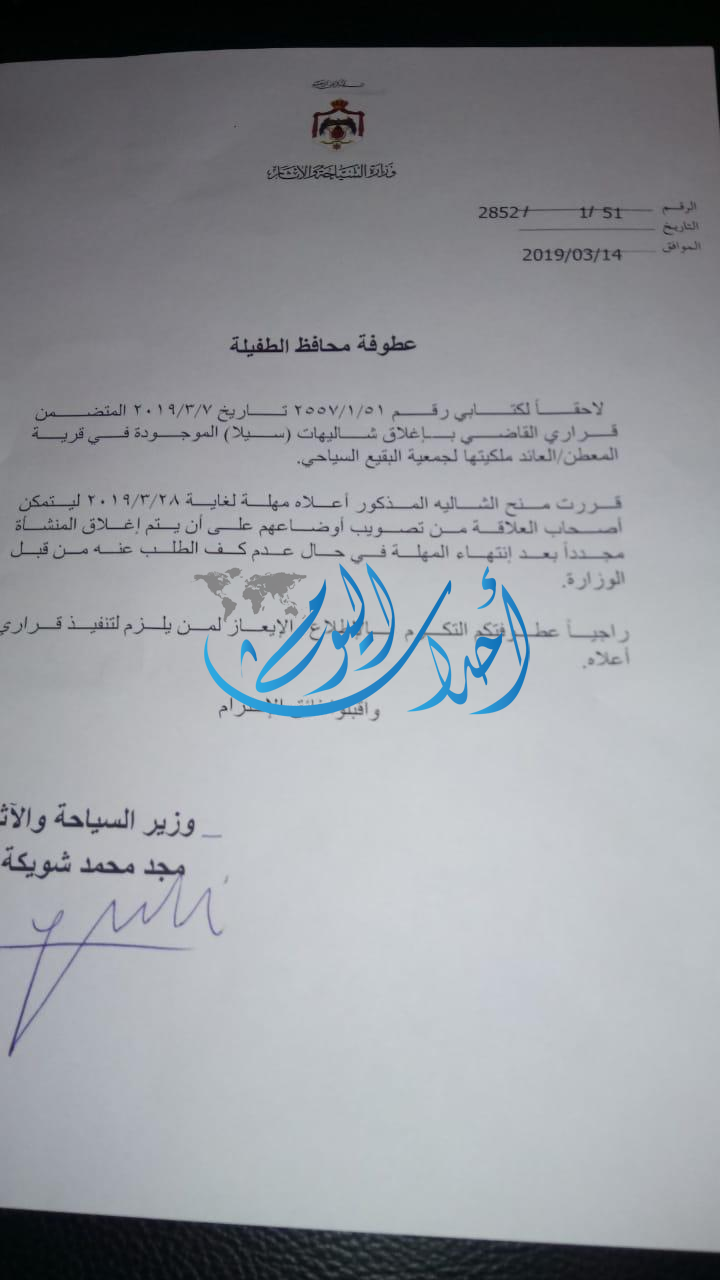 توجهنا مباشرة إلى وزارة السياحة والآثار وتم إعلامهم بكافة التفاصيل وعلى إثر ذلك حصلنا على كف طلب ومهله لغاية ٢٨/٣ لتصويب الأوضاع وبالفعل تم تفعيل القرار يوم الأحد الموافق ١٧/٣ بفتح الموقع ولكن أتى قرار باغلاق الموقع مرة أخرى بعد ساعتين، تابعنا التواصل مع مديرية سياحة الطفيلة والإستفسار عن سبب الإغلاق مرة أخرى حيث تم إعلامنا بأن الاغلاق جاء بطلب من رئيس الجمعية حسين الشباطات يطلب التأكيد على إغلاق الموقع.