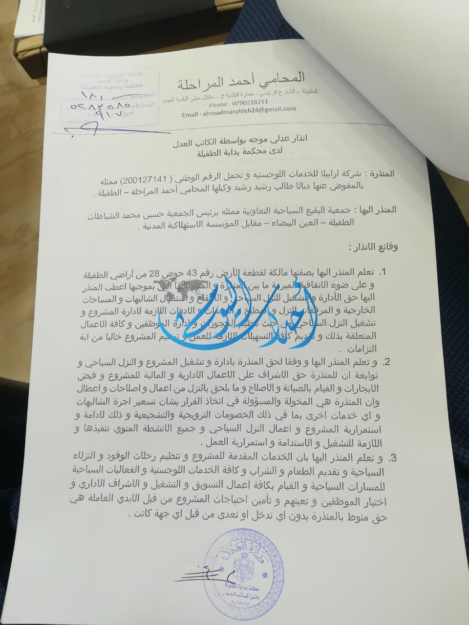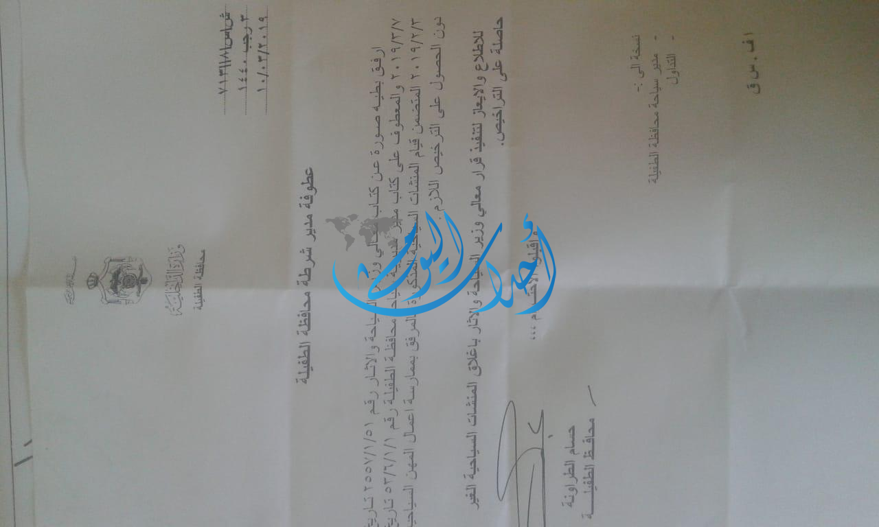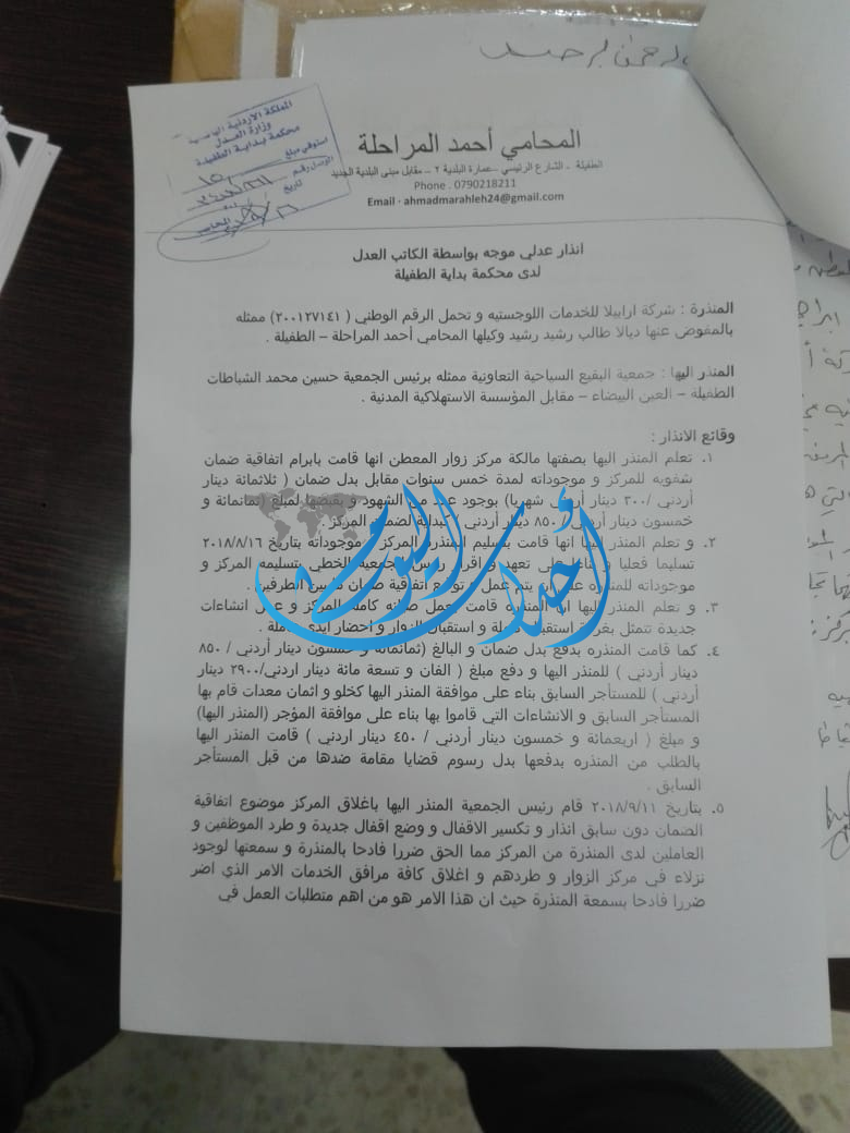 قمنا بتزويد مديرية سياحة الطفيلة بإتفاقية الإدارة والتشغيل وتم تزويدها بالإنذارات العدلية والطلب منهم التوسط لتقديم جمعية البقيع الأوراق المطلوبة للتسجيل ولكن دون أي رد أو تعاون.