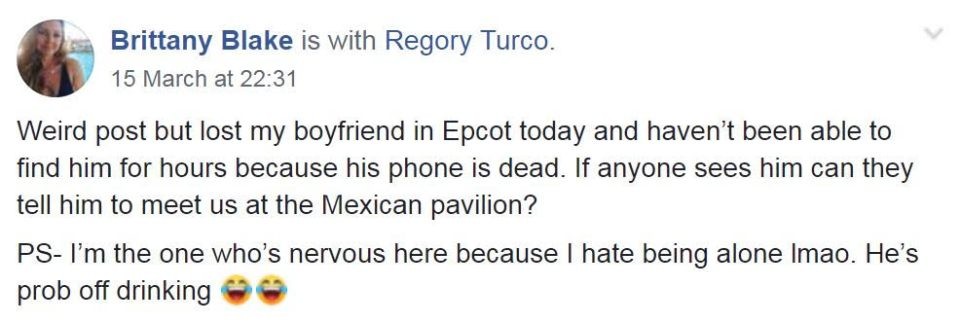 وتتحدث القصة عن فتاة أمريكية تدعى، بريتاني بليك، كانت برفقة خطيبها في متنزه "Walt Disney World" الشهير. وأثناء الجولة، انشغلت الفتاة عن الشاب لبضع دقائق، لتفقد أثره ضمن الحشد الكبير من زوار المتنزه، فلجأت إلى مواقع التواصل الاجتماعي في محاولة للعثور عليه.