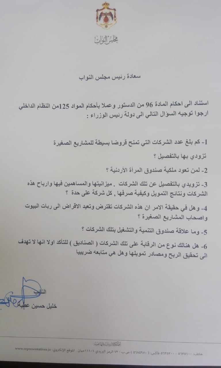 أحداث اليوم - وجه النائب خليل عطية مجموعة من الأسئلة لرئيس الوزراء عمر الرزاز من خلال مذكرة نيابية تعلقت بقضية الغارمات وحول الشركات التي تمنح قروض للمشاريع الصغيرة، وعن ملكية صندوق المرأة الأردنية.