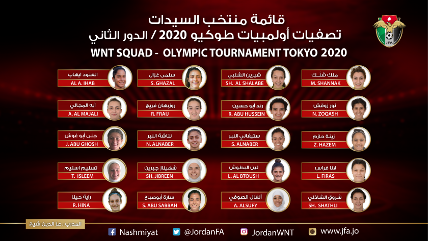 وضمت القائمة 20 لاعبة هن: شيرين الشلبي، ملك شنك، سلمى غزال، العنود ايهاب، نور زوقش، رند ابو حسين، روزبهان فريج، آية المجالي، زينة حازم، ستيفاني النبر، جنى ابو غوش، لانا فراس، نتاشا النبر، لين البطوش، شهناز جبرين، تسنيم اسليم، شروق الشاذلي، انفال الصوفي، راية حينا وسارة ابو صباح.