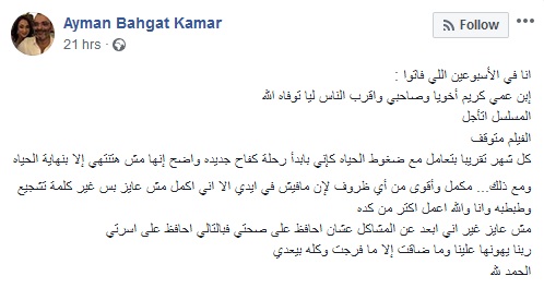وأعلن أيمن في تدوينة عبر "فايسبوك" عن تأجيل المسلسل حيث كتب: "انا في الأسبوعين اللي فاتوا: