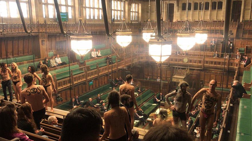 فخلال الجلسة البرلمانية مساء الاثنين، دخلت ست فتيات وستة رجال القاعة المخصصة للجمهور، وهي مطلة على القاعة الرئيسية للبرلمان، ليقوم الجميع بخلع ملابسهم، باستثناء قطعة صغيرة من الملابس تغطي بعض الأجزاء السفلية من الجسم، لتظهر عبارات مكتوبة على الجسم، مثل نداء الاستغاثة (SOS)، ورسومات، كما هتفوا بـ"العدالة للبيئة".