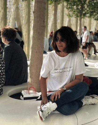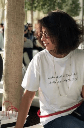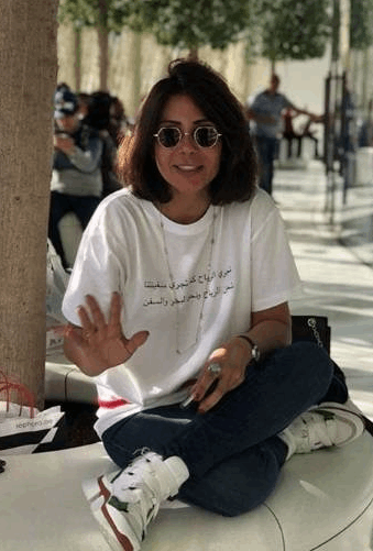منى ارتدت تيشيرت أبيض كتب عليه بيت من الشعر، حرصت أن يظهر في الصور وبنطال جينز وانتعلت حذاء رياضياً.