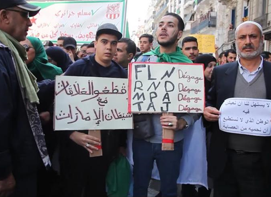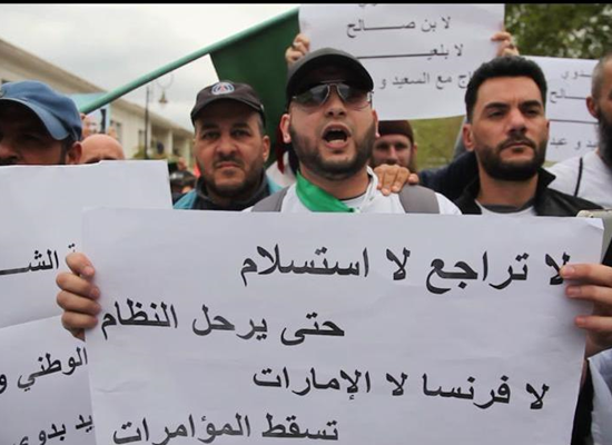 ورفع المتظاهرون الجزائريون لافتات كتبوا عليها "لا فرنسا، لا الإمارات"، مطالبين برحيل نظام بوتفليقة كاملا، وليس استقالة الرئيس فقط.
