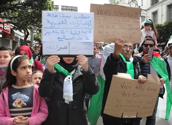 وقبل إعلان بوتفليقة استقالته، رفع متظاهرون جزائريون لافتات احتجاجية، كتب عليها: "تسقط الإمارات.. يسقط بوتفليقة".