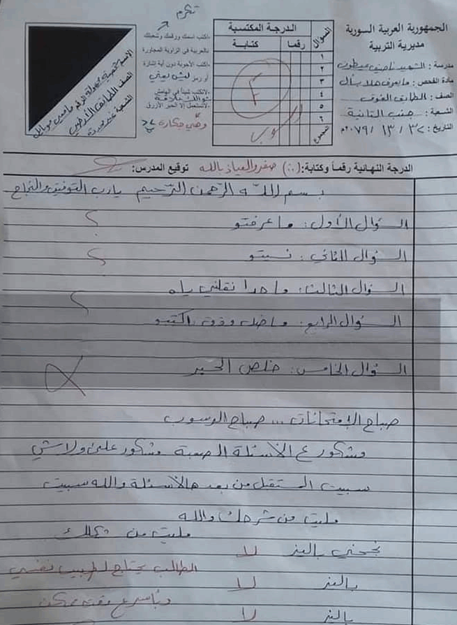 أحداث اليوم - انتشرت على مواقع التواصل الاجتماعي صورة لورقة امتحان قال الناشطون إنّها تعود لأحد الطلاب في دولةٍ عربيّة.