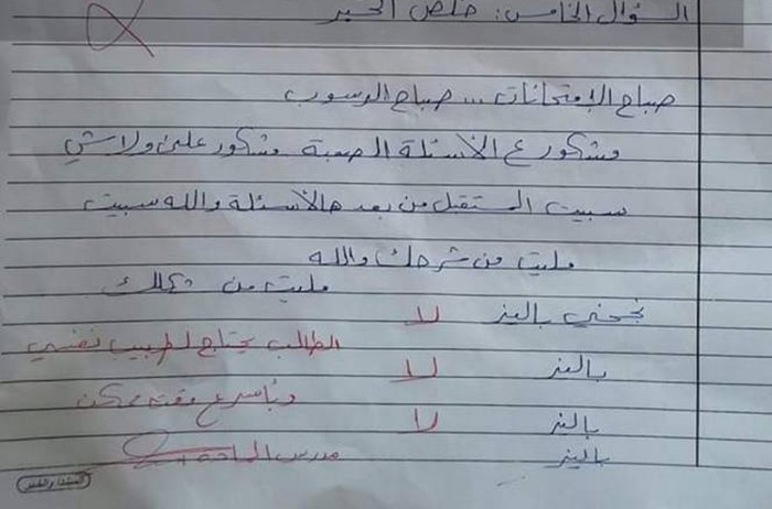 وتناول الطالب مضمون ما كتبه في المسابقة بطريقة كوميدية ساخرة، وكتب المصحِّح بالأحمر "الطالب يحتاج لطبيب نفسي وبأسرع وقت".