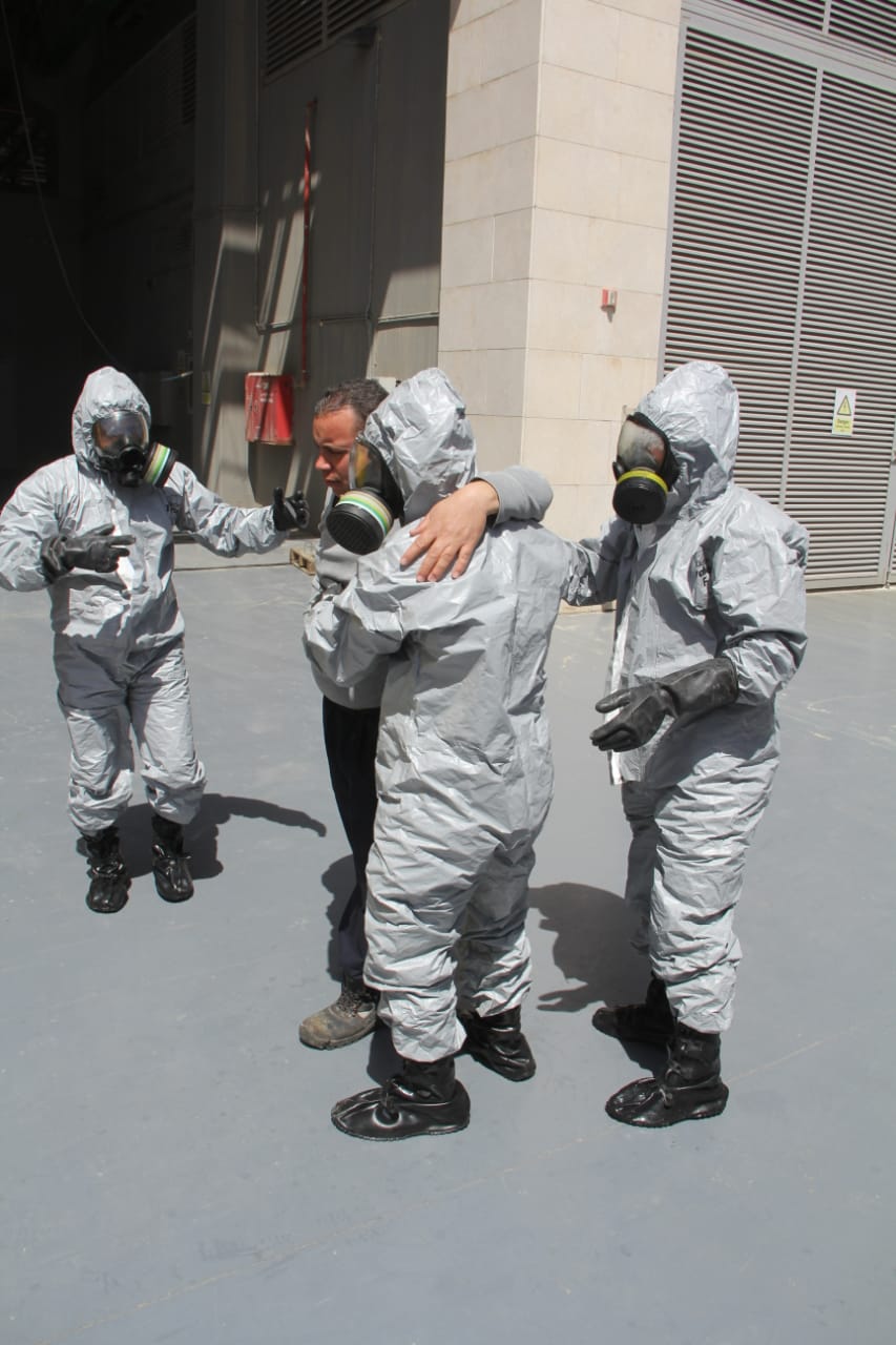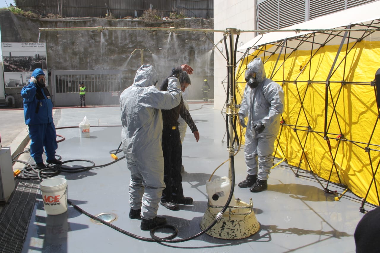 حيث اشتملت فرضيات التمرين على تسرب غاز الامونيا من الطابق الأرضي مما نتج عنه إصابتين بضيق بالتنفس كما أسفر تشغيل أنظمة الشفط لاحتواء مادة الغاز المتسربة ، إلى زيادة في الحمل على قواطع الكهرباء مما أدى إلى