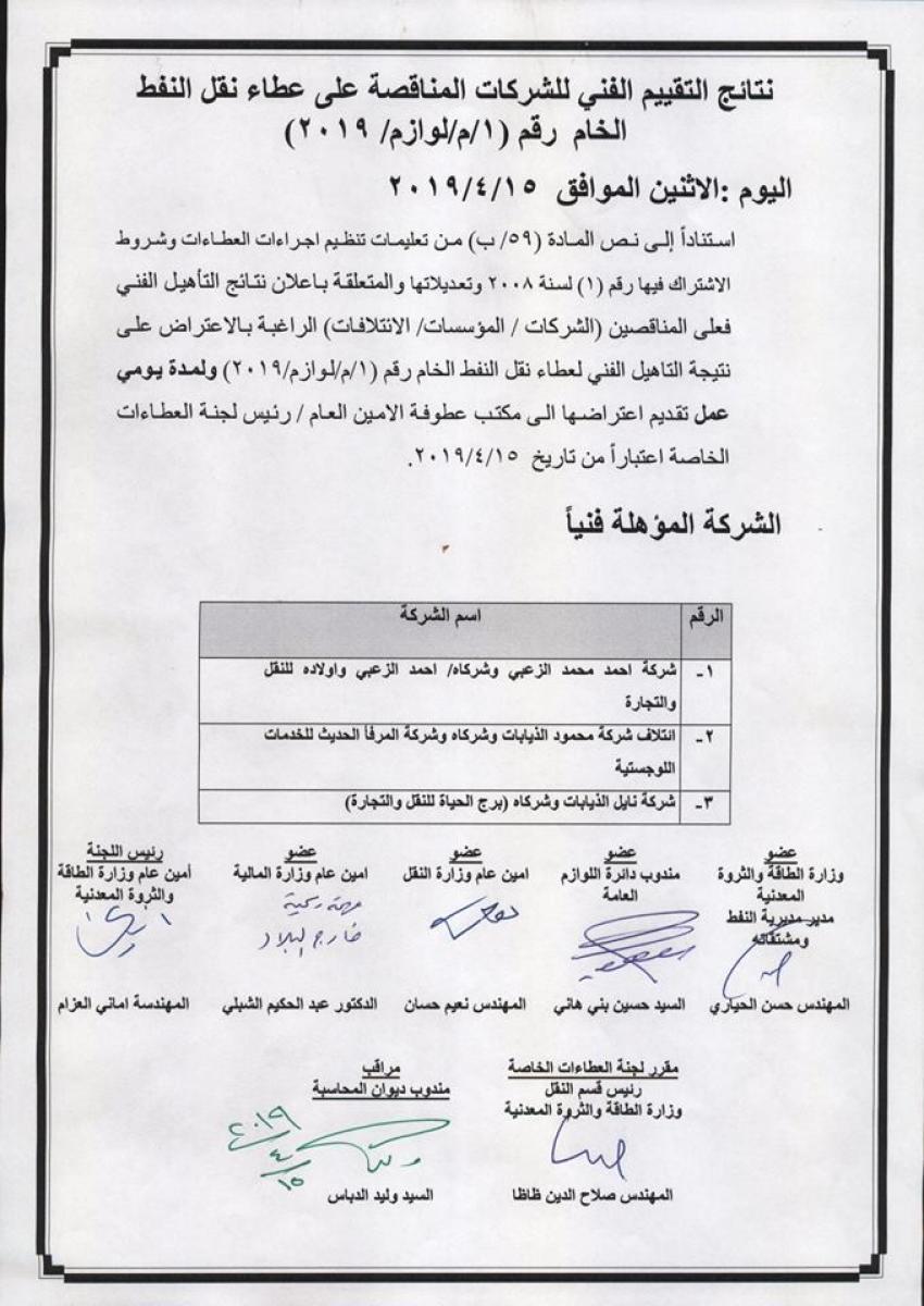 أحداث اليوم - اعلنت وزارة الطاقة والثروة المعدنية الاثنين نتائج التقييم الفني للشركات المناقصة على عطاء نقل النفط الخام العراقي، والذي نجحت به 3 شركات.
