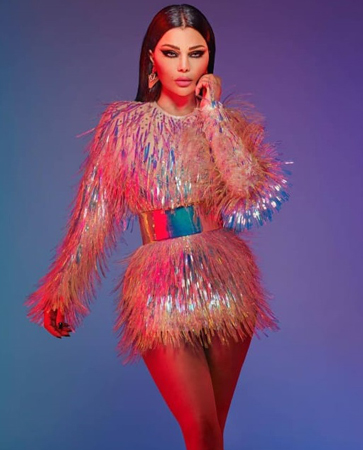 هيفاء وهبي: إطلالة مثيرة وجريئة ظهرت بها هيفاء وهبي في آخر صورها على إنستغرام، فستان قصير من علامتها المفضلة "بالمان"، مزيّن بالريش الملوّن المضيء، مع حزام معدني عريض.