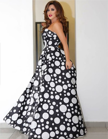 نجوى كرم: إطلالة عصرية بفستان أسود منفوش بلا كتفين من ناتالي كرم، مع طبعة النقاط البيضاء المختلفة الأحجام، ابتعدت بها عن التصاميم التي باتت تقليدية ومكررة عليها.