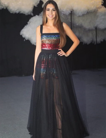 فاليري أبو شقرا: في نفس الحدث، تألقت فاليري أبو شقرا ملكة جمال لبنان السابقة، بفستان شفاف من إيلي صعب، مع باديسوت ضيّق أسفله بألوان قوس قزح اللامعة.