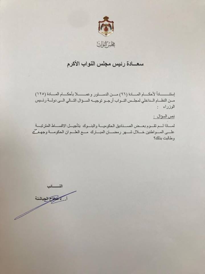 أحداث اليوم - وجه النائب صداح الحباشنة سؤالاً نيابياً إلى الحكومة حول عدم تأجيل العديد من البنوك أقساط الديون البنكية في شهر رمضان، كما وعدت وصرحت حكومة الرزاز.