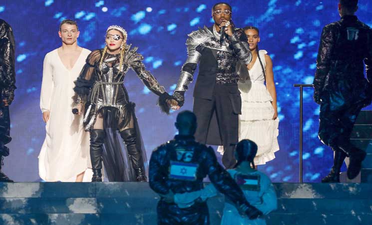 أحداث اليوم - أغضبت مغنية البوب الأمريكية مادونا، ليلة السبت، الإسرائيليين خلال أدائها اغنيتين كضيفة شرف في مسابقة الأغنية الأوروبية “يوروفيجن” بتل أبيب، بوضع علم فلسطين على ظهر إحدى أعضاء فرقتها وآخر يضع علم إسرائيل.