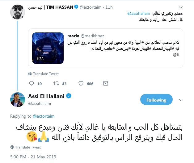 بدوره، غرّد بطل "الهيبة" تيم حسن موجّها الشكر للحلاني حيث كتب: "محبتي وتقديري للغالي عاصي الحلاني كل الشكر على رأيك ومتابعتك"، ليرّد الحلاني قائلاً: "بتستاهل كل الحب والمتابعة يا غالي لأنك فنان ومبدع بينشاف الحال فيك وبترفع الراس بالتوفيق دائماً باذن الله".