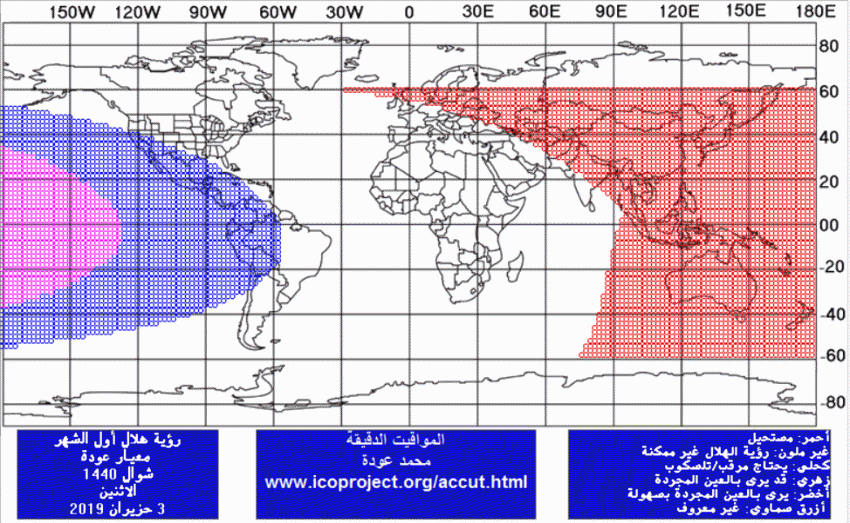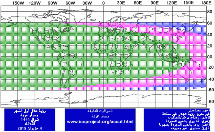 وستكون إمكانية رؤية الهلال يوم الإثنين 03 يونيو/حزيران 2019 ويوم الثلاثاء 4 يونيو/حزيران 2019 باستخدام برنامج المواقيت الدقيقة باعتماد معيار عودة، على النحو التالي:
