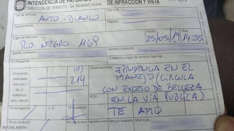 أحداث اليوم - تلقت فتاة كانت تسير بسيارتها في أحد الشوارع في أوروغواي، مخالفة لم تكن في الحسبان، كما أن السبب الذي أعطى بموجبه الشرطي المخالفة للفتاة كان غريبا، الأمر الذي استدعى التحقيق في الحادثة.