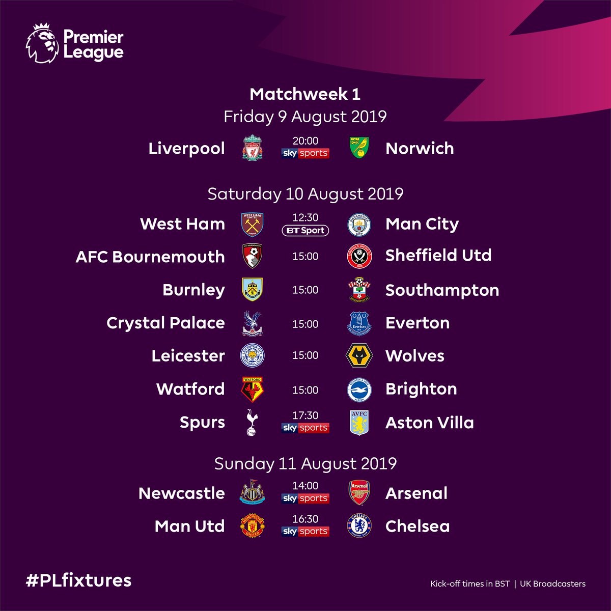 ويبدأ البطل مانشستر سيتي حملة الدفاع عن لقبه بمواجهة ويست هام، في حين يستهل الوصيف ليفربول حامل لقب دوري أبطال أوروبا مشواره في الدوري بمواجهة نورويتش العائد حديثا إلى دوري الأضواء.