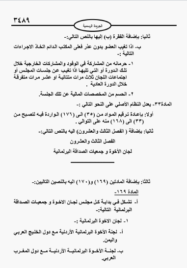 وأقر مجلس النواب نصا في النظام الداخلي يعطي المكتب الدائم الحق بحرمان النائب من المشاركة في الوفود والمشاركات الخارجية خلال تلك الدورة أو التي تليها اذا تغيب عن جلسات المجلس أو اجتماعات اللجان ثلاث مرات متتالية او عشر مرات متفرقة خلال الدورة العادية بدون عذر.