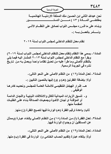 أحداث اليوم - صادق الملك عبدالله الثاني على نظام مجلس النواب الداخلي لعام 2019.