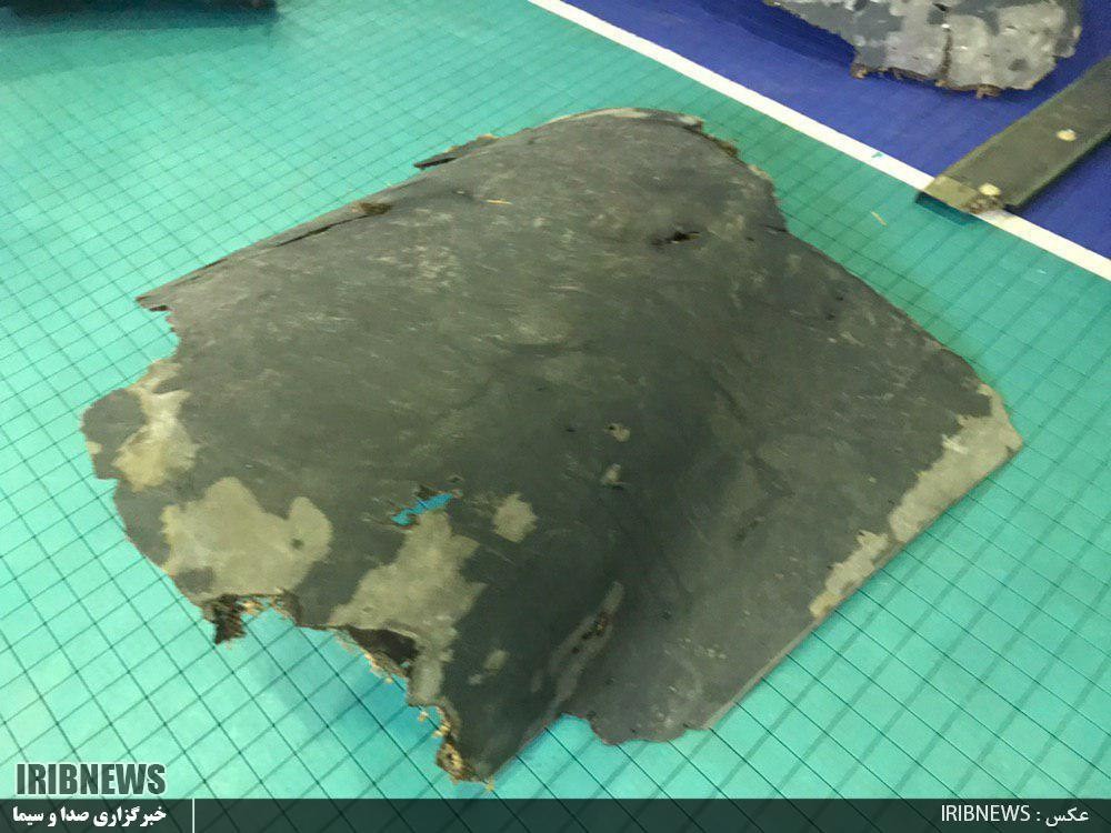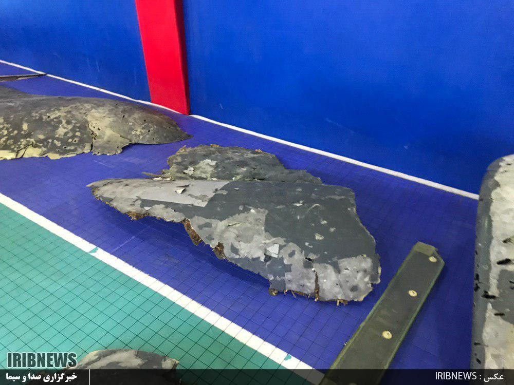 وتظهر الصور بقايا مختلفة من الطائرة التي أكد الحرس الثوري إسقاطها فجر أمس "بعد دخولها أجواء البلاد وليس فوق المياه الدولية".
