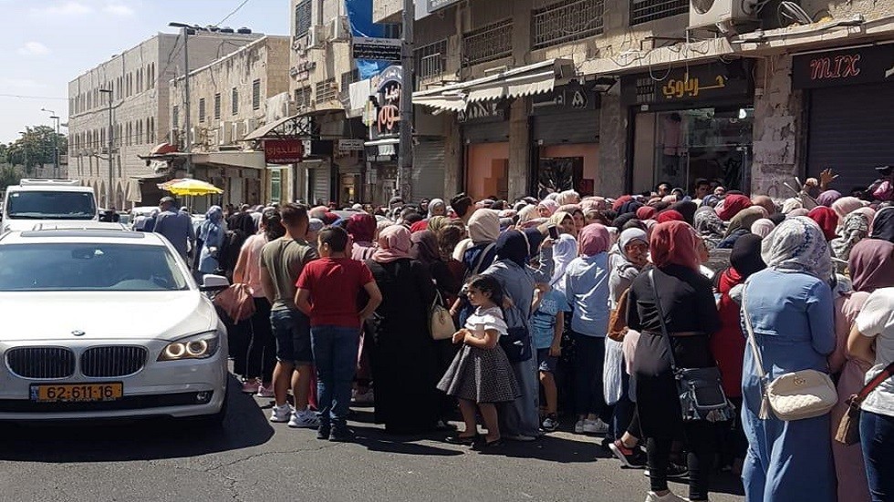تدافعت مئات من الفتيات والنسوة، أمام متجر للمستحضرات التجميلية "المكياج" في شارع صلاح الدين بمدينة القدس، عقب إعلانه عن عروض على أسعار المستحضرات.