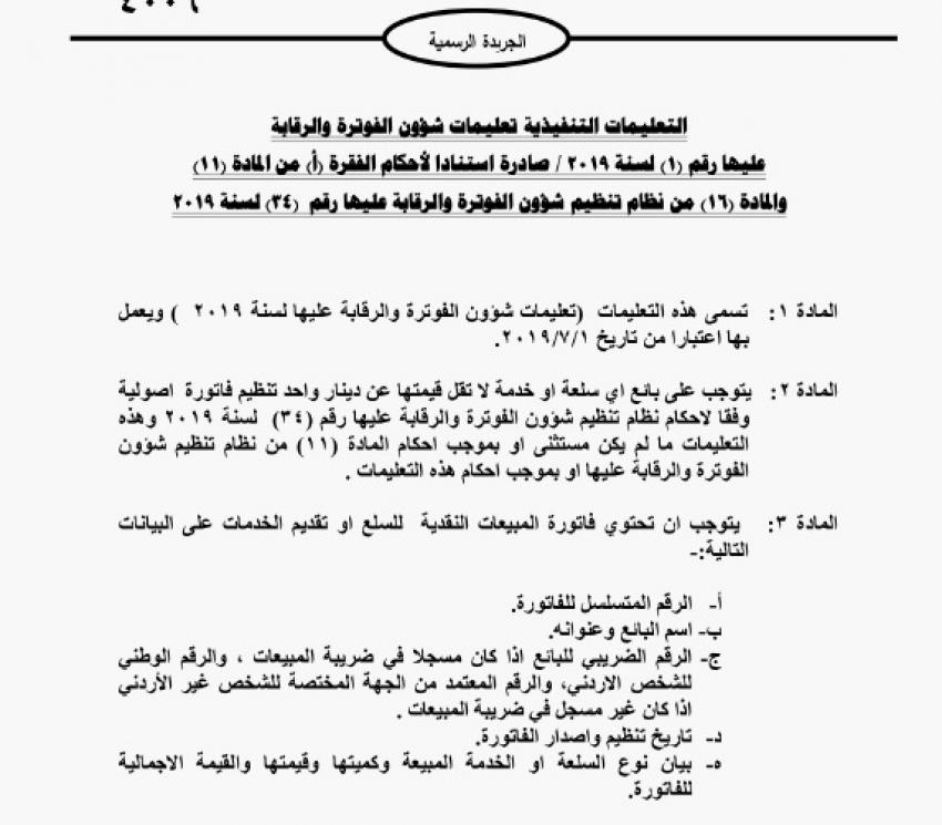 أحداث اليوم - صدر في عدد الجريدة الرسمية، الخميس التعليمات التنفيذية تعليمات شؤون الفوترة والرقابة عليها رقم (1) لسنة 2019.وتاليًا التعليمات: