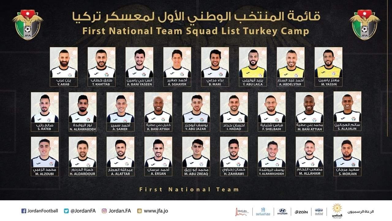 وضمت القائمة لمعسكر تركيا: معتز ياسين، احمد عبد الستار، يزيد ابو ليلى، براء مرعي، احمد الصغير، انس بني ياسين، طارق خطاب، يزن العرب، سالم العجالين، محمد بني عطية، فراس شلباية، احسان حداد، يوسف ابو جزر، خليل بني عطية، احمد سمير، نور الروابدة، صالح راتب، سعيد مرجان، مصعب اللحام، يوسف الرواشدة، حسان زحراوي، محمد ابو زريق، احمد عرسان، عبدالله العطار، حمزة الدردور ومحمد الزعبي.