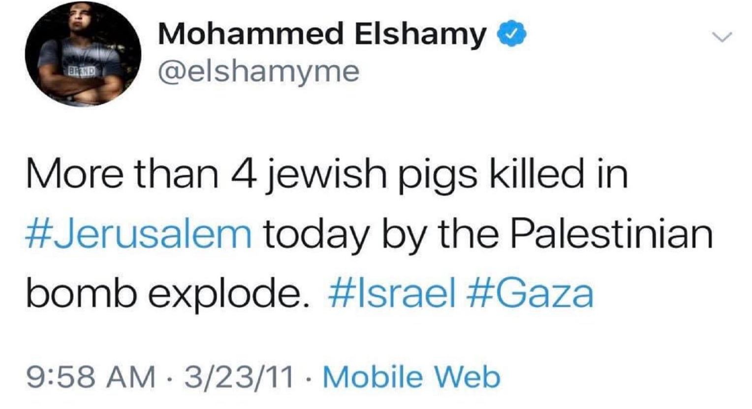 أحداث اليوم - قدم محرر الصور المصري محمد الشامي استقالته من عمله أمس، الجمعة، وذلك بعد ضغوط تعرّض لها بسبب إعادة نشر تغريدة له، كتبها على "تويتر" قبل 8 سنوات، وتحديداً في 23 آذار/مارس 2011، كتب فيها "أكثر من 4 'خنازير يهود' قتلوا في القدس اليوم في انفجار قنبلة فلسطينية".