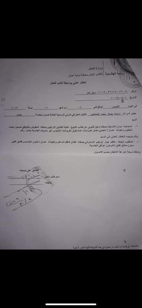 ووفقا للإنذار العدلي الدي وصل لـ"احداث اليوم" نسخة عنه، فإن الساهر يُمارس نشاطه في الأردن، دون أخذ تصريح نقابة الفنانين الأردنيين.