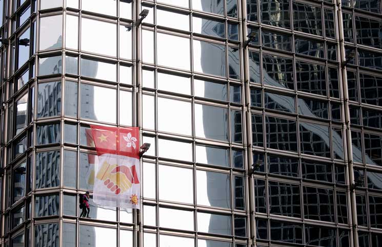 ولم يكتف روبرت بالتسلق فحسب، بل قام برفع "راية سلام" في المبنى أيضاً. وتشتمل الراية على صورة ليدين تتصافحان تحت علمي الصين وهونغ كونغ.